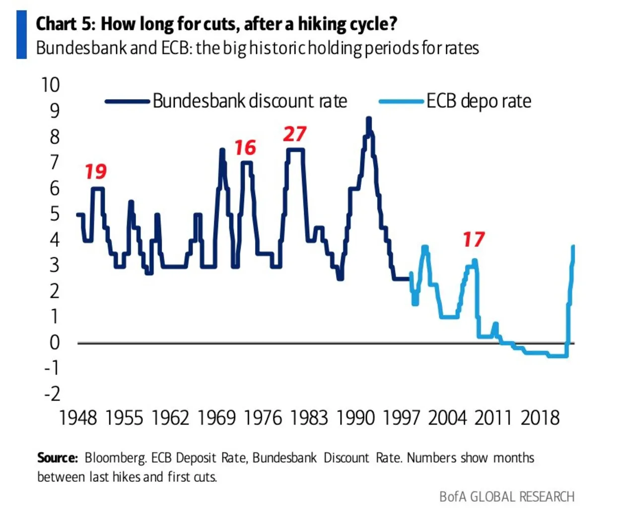 En este gráfico de Bank of America tenemos las oscilaciones históricas de tipos desde 1948 hasta nuestros días. En concreto, hasta mediados de los 90 podemos ver los niveles de la 'Bundesbank discount rate', es decir, la tasa de descuento del banco central de Alemania, que se utilizaba en el pasado como la herramienta de política monetaria en el país, antes de que se introdujera el euro como moneda única en la zona del euro.