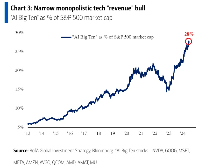 Estas 10 empresas ya representan de hecho el 28% de toda la capitalización de mercado del S&P 500. Desde 2013, donde el "Big Ten de IA" representaba apenas el 5% del S&P 500, su influencia ha aumentado de manera constante.