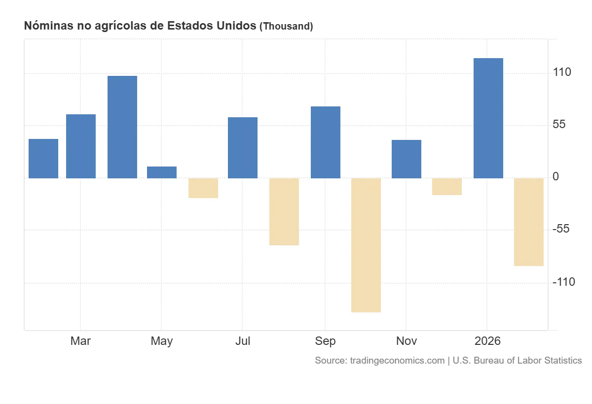 Además, el organismo revisó a la baja las cifras de los meses anteriores. En diciembre, el dato pasó de una creación de 48.000 empleos a una destrucción de 17.000, lo que supone un ajuste de 65.000 puestos. Por su parte, la lectura de enero se redujo en 4.000 empleos, desde los 130.000 inicialmente estimados hasta los 126.000. Con estas revisiones, el empleo total de diciembre y enero resulta 69.000 puestos inferior a lo informado previamente.