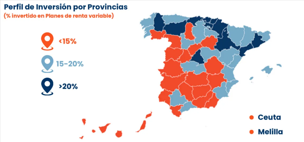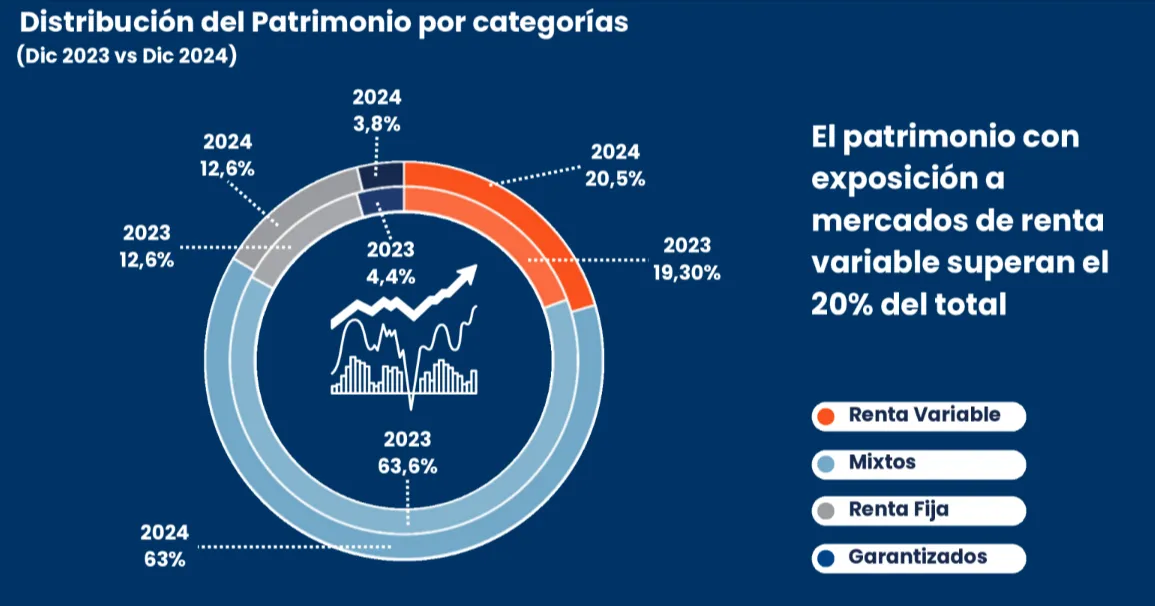 A cierre de 2024, el 83,5% del patrimonio en PPI estaba invertido en categorías mixtas o de renta variable (82,9% en 2023). La renta variable pura aumentó hasta el 20,5% del total, con Madrid (27,4%) y País Vasco (25,3%) como las regiones con mayor exposición.