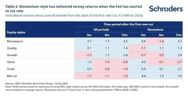 "El estilo 'momentum' ha sido, de media, el sector del mercado que mejor se ha comportado durante los pasados recortes de tipos", afirman Fong y Read. Este estilo no solo se ha beneficiado de la confianza inversora antes del recorte, sino que su rendimiento ha mejorado tras el primer recorte de tipos.