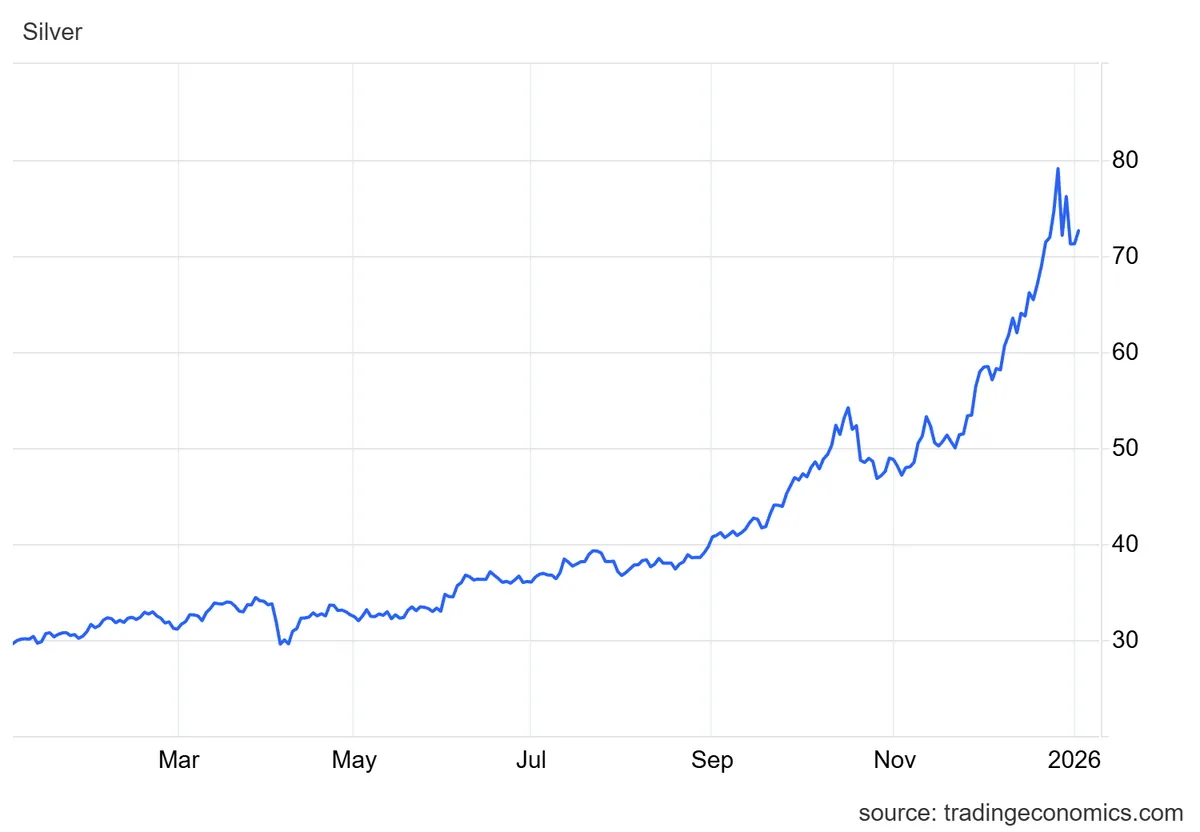 La plata es famosa por tener un comportamiento más “nervioso” que el oro. Tras subidas muy verticales, también hemos visto episodios de corrección brusca. Pero con el subidón de final de año del oro, el metal plateado lo ha hecho aún mejor.