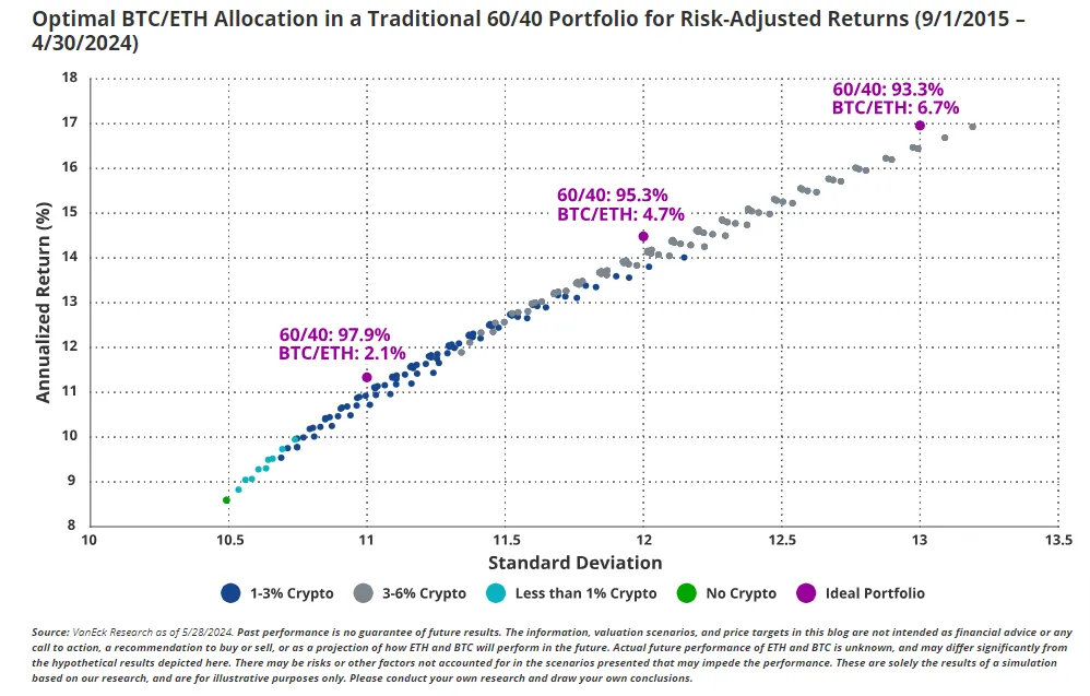 El análisis también sugiere que una asignación del 6% en criptomonedas dentro de una cartera tradicional 60/40 puede mejorar significativamente el ratio de Sharpe, lo que indica mejores retornos ajustados por riesgo.