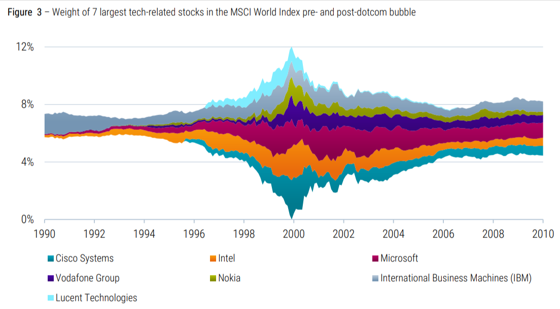 Durante la burbuja tecnológica, un reducido grupo de valores —entre ellos Cisco Systems, Intel, Microsoft, Vodafone, Nokia, IBM y Lucent Technologies— llegó a dominar el liderazgo del MSCI World, aunque “en menor grado” que la concentración actual.
