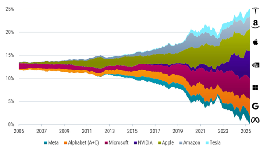 Las llamadas Magnificent Seven —Alphabet, Amazon, Apple, Meta, Microsoft, Nvidia y Tesla— superan ya una cuarta parte del MSCI World (con datos hasta el 31 de octubre de 2025), una evolución que ha reducido el número efectivo de compañías que explican la rentabilidad del índice global de más de 300 en 2005 a solo 84.
