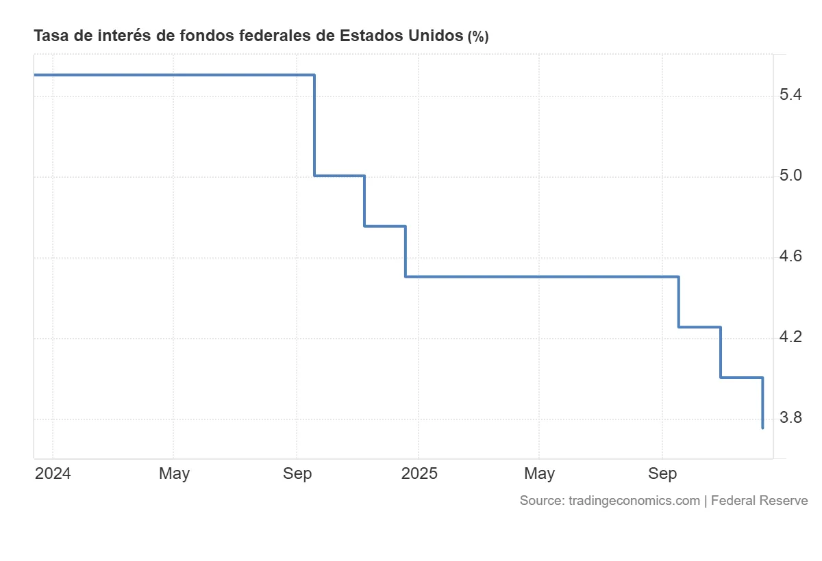 La Reserva Federal de Estados Unidos (Fed) decidió este miércoles recortar los tipos de interés en 25 puntos básicos por tercera vez consecutiva, situando el rango objetivo en el 3,5%-3,75%, en medio de una división de opiniones cada vez más fuerte en el organismo.