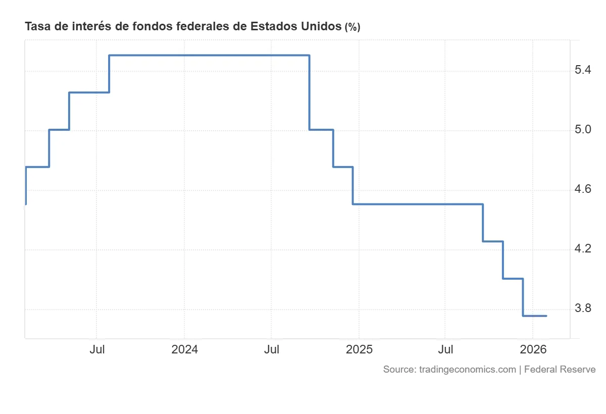 La Reserva Federal de Estados Unidos (Fed) ha decidido este miércoles mantener los tipos de interés en el rango objetivo del 3,50% al 3,75%, en niveles similares a los de finales de 2022, poniendo fin a la racha de recortes de 25 puntos básicos que había comenzado en septiembre y que había continuado en octubre y diciembre.