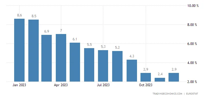 La inflación de la eurozona vuelve a subir: 2,9% en diciembre (con la subyacente bajando)