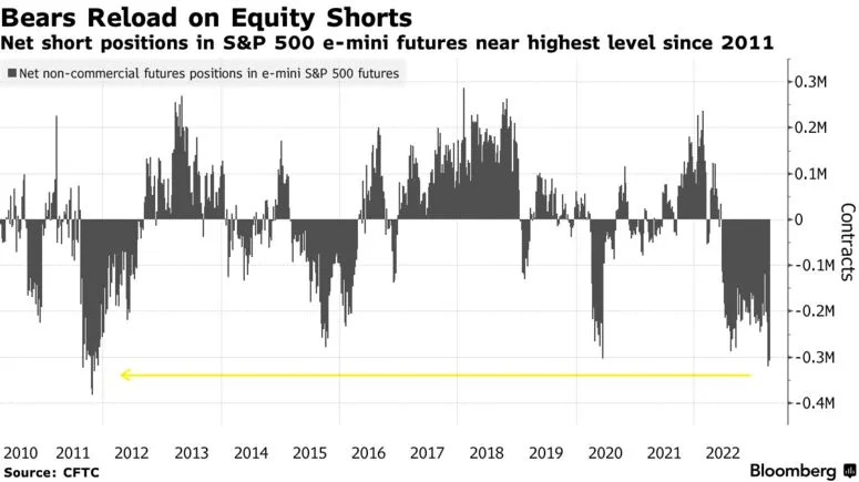 Según datos de la Commodity Futures Trading Commission (CFTC) recogidos por Bloomberg, estos grandes fondos de cobertura vieron aumentar sus posiciones cortas netas en futuros del S&P 500 e-mini en 321.000 contratos a principios de mes, una lectura que no se veía desde hace más de 11 años.