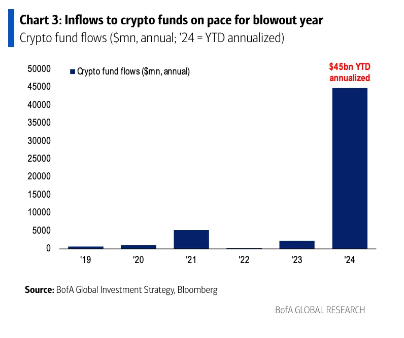 En lo que va de año, las entradas a fondos de criptomonedas llegan hasta 7.700 millones de dólares, según el último informe "The Flow Show" de Bank of America.