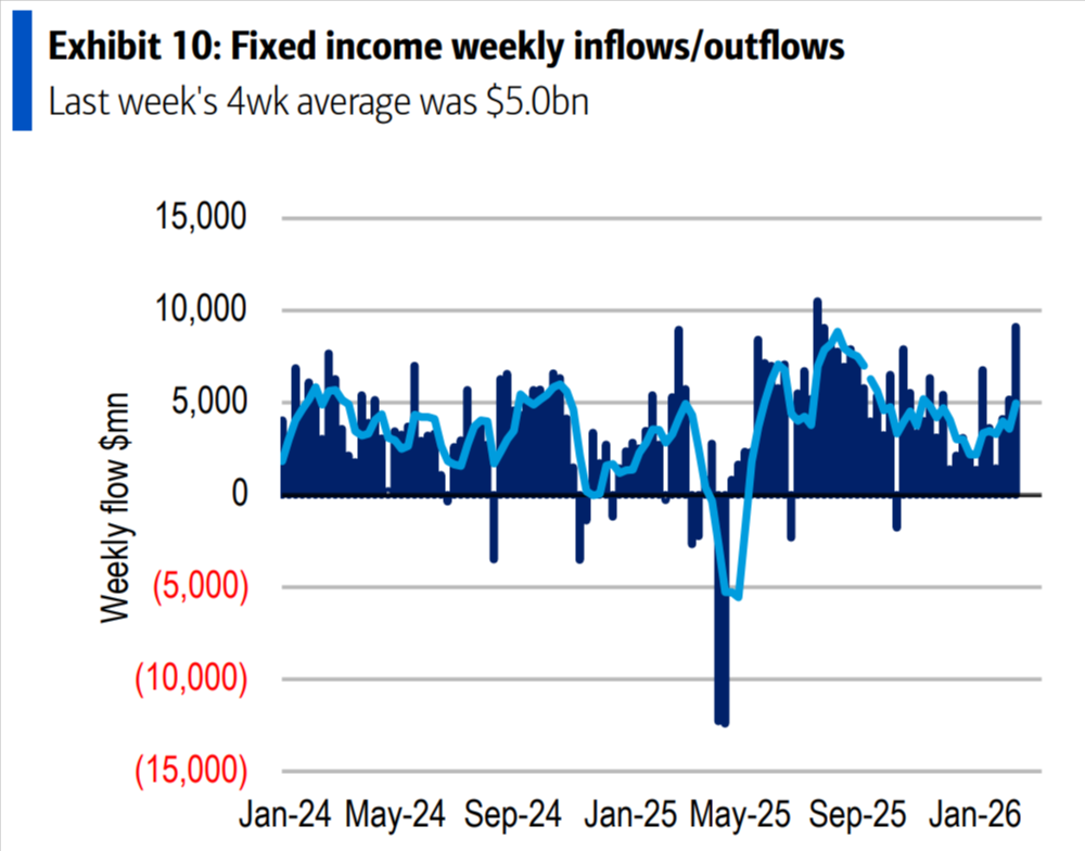 El crédito europeo continúa atrayendo capital de forma sostenida, incluso en un entorno de mayor fragilidad en otros activos de riesgo. Según el último informe 'Follow The Flow' de Bank of America, referente a los fondos de inversión radicados en Europa, los fondos de renta fija acumulan 18 semanas consecutivas de entradas, con 9.116 millones de dólares en la última semana y 31.639 millones en el acumulado anual.