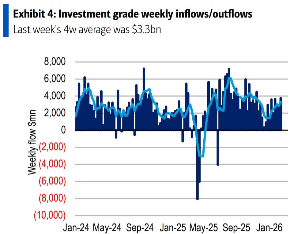 Los fondos de grado de inversión (IG) registraron una nueva semana de entradas, encadenando 34 semanas consecutivas de flujos positivos. En la última semana captaron 3.760 millones de dólares y acumulan 20.332 millones en lo que va de año. Algo que “pone de relieve la importancia de los factores técnicos en los mercados de crédito”, destacan desde Bank of America.