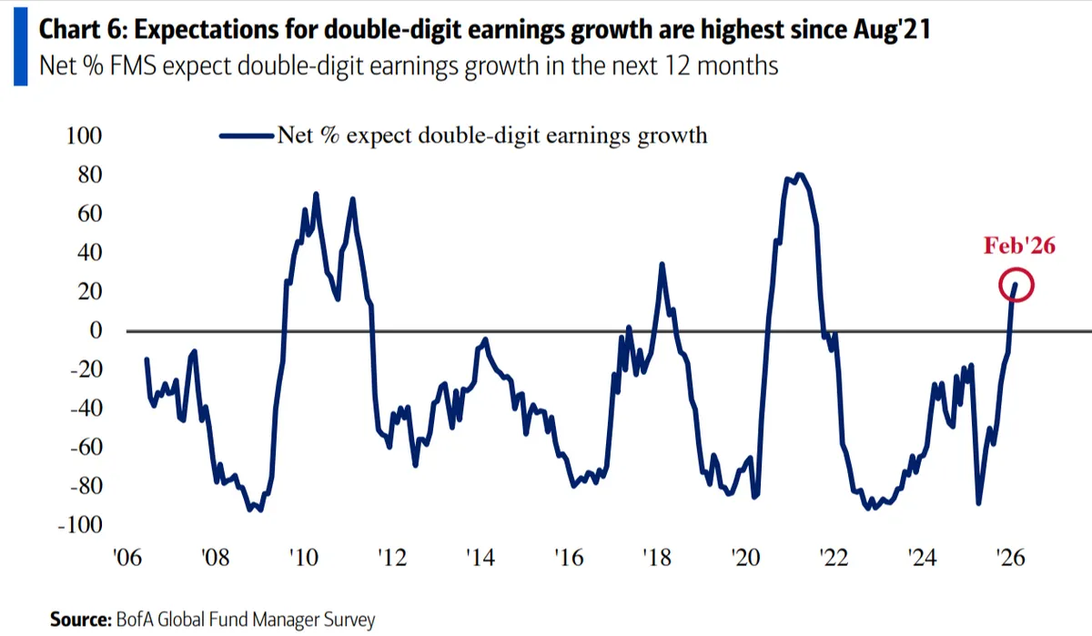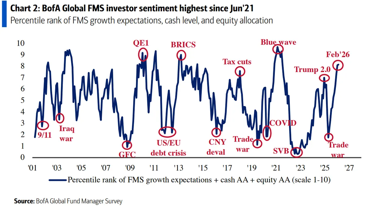 El BofA Global Fund Manager Survey de febrero 2026 refleja el optimismo creciente entre los inversores, aunque advierte sobre riesgos asociados a la burbuja de IA y la sobreinversión de las tecnológicas