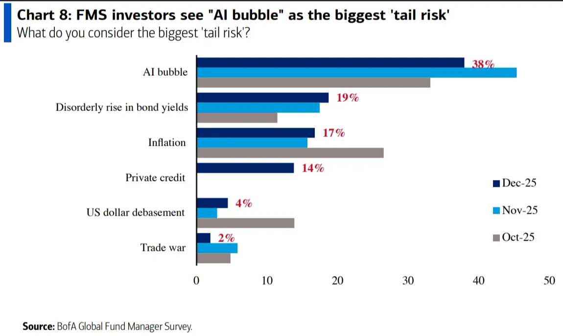 Pese al optimismo generalizado, los gestores no ignoran los riesgos. Por tercer mes consecutivo, la burbuja en inteligencia artificial es señalada como el principal tail risk por el 38% de los encuestados, aunque este porcentaje ha bajado ligeramente respecto a noviembre. A ello se suma la preocupación por un posible evento de crédito, con el private equity y el private credit como principales focos de riesgo sistémico.
