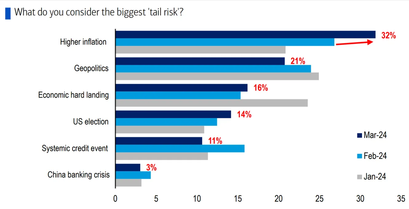 Respecto a los riesgos, la mayor preocupación en un horizonte a 12 meses para los gestores es el riesgo de que la inflación siga siendo alta, ampliando incluso la diferencia con otros riesgos percibidos por estos inversores como la geopolítica o el riesgo de un aterrizaje fuerte. También crece el riesgo asociado a las elecciones en Estados Unidos.