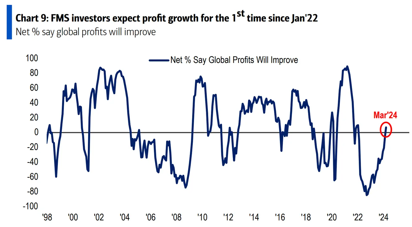 El porcentaje neto de inversores que espera una mejora en los beneficios globales es positivo por primera vez desde enero de 2022.