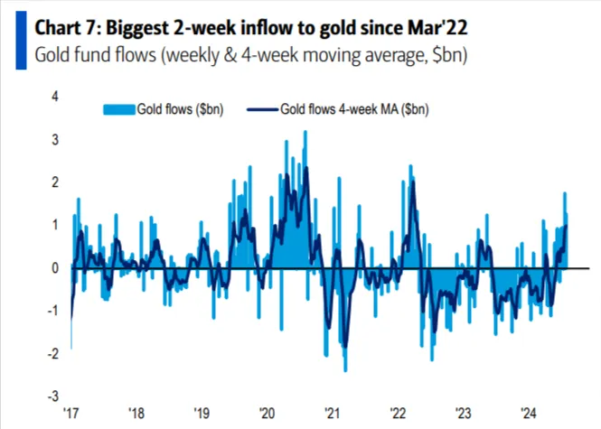 Este cóctel explosivo (rendimiento y posible protección ante caídas del mercado) es probable que haya animado a estos inversores a invertir en vehículos que invierten en oro. De ahí que, según los últimos datos de Bank of America en su informe "The Flow Show", los fondos y ETFs de oro hayan experimentado su mayor entrada de dinero en dos semanas desde marzo de 2022, con 1.300 millones de dólares esta semana, mientras que se producen las mayores salidas de efectivo