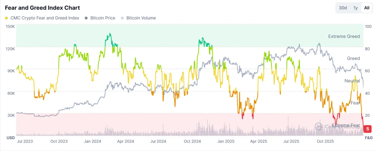 Esa pérdida de confianza puede verse en el Índice de Miedo y Codicia de Criptomonedas de CoinMarketCap, que ahora mismo se encuentra en un nivel de 5 sobre 100. Es decir: miedo extremo en el mercado cripto. Un nivel que no se había visto nunca.