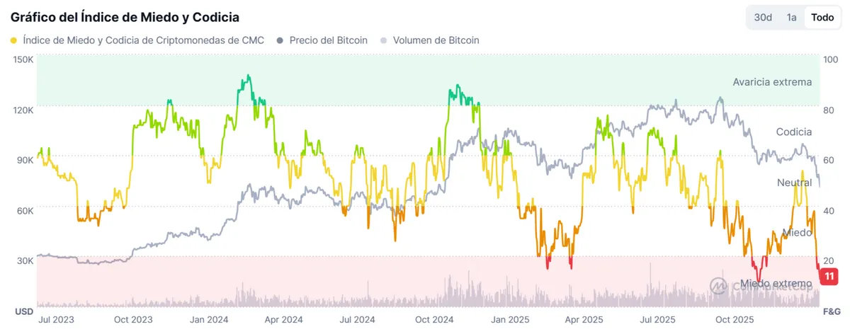 Esa pérdida de confianza puede verse en el Índice de Miedo y Codicia de Criptomonedas de CoinMarketCap, que ahora mismo se encuentra en un nivel de 11 sobre 100. Es decir: miedo extremo en el mercado cripto. Un nivel que no se alcanzaba desde noviembre del año pasado y que no suele ser algo habitual.