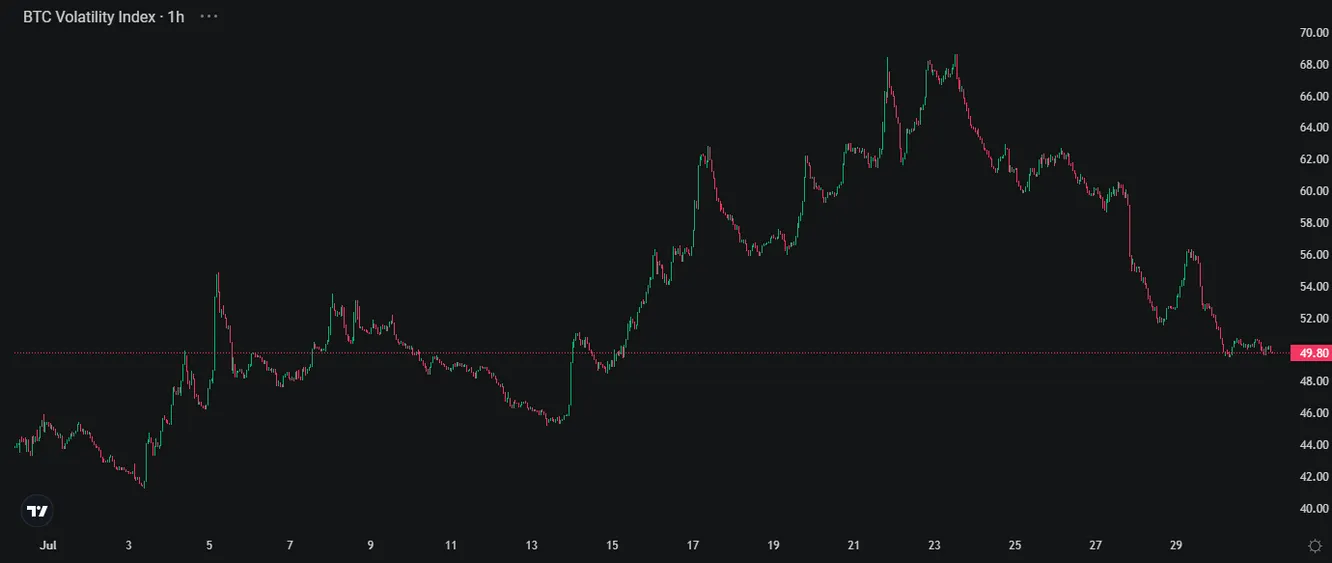 En contraste, el BTC Volatility Index de la plataforma de criptomonedas Deribit, que mide la volatilidad implícita a 30 días de Bitcoin, ha disminuido del 68% al 49%. También lo ha hecho Asimismo, el índice ETH Volatility Index, que mide lo propio con la criptomoneda ether, cayendo del 70% al 55%.