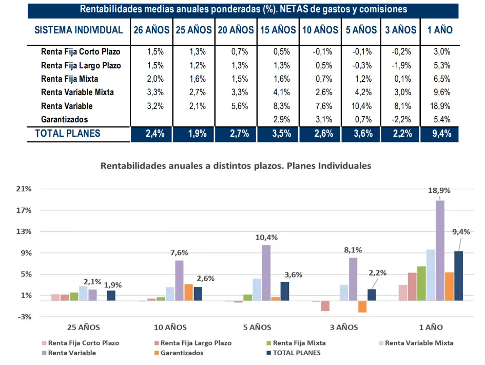 Además de los excelentes resultados a corto plazo, los planes de pensiones también muestran rentabilidades medias positivas a medio y largo plazo. En un horizonte de 20 años, estos planes registraron una rentabilidad media anual (neta de gastos) del 2,7%. Para periodos de 10 y 15 años, las rentabilidades fueron del 2,6% y 3,5% respectivamente.