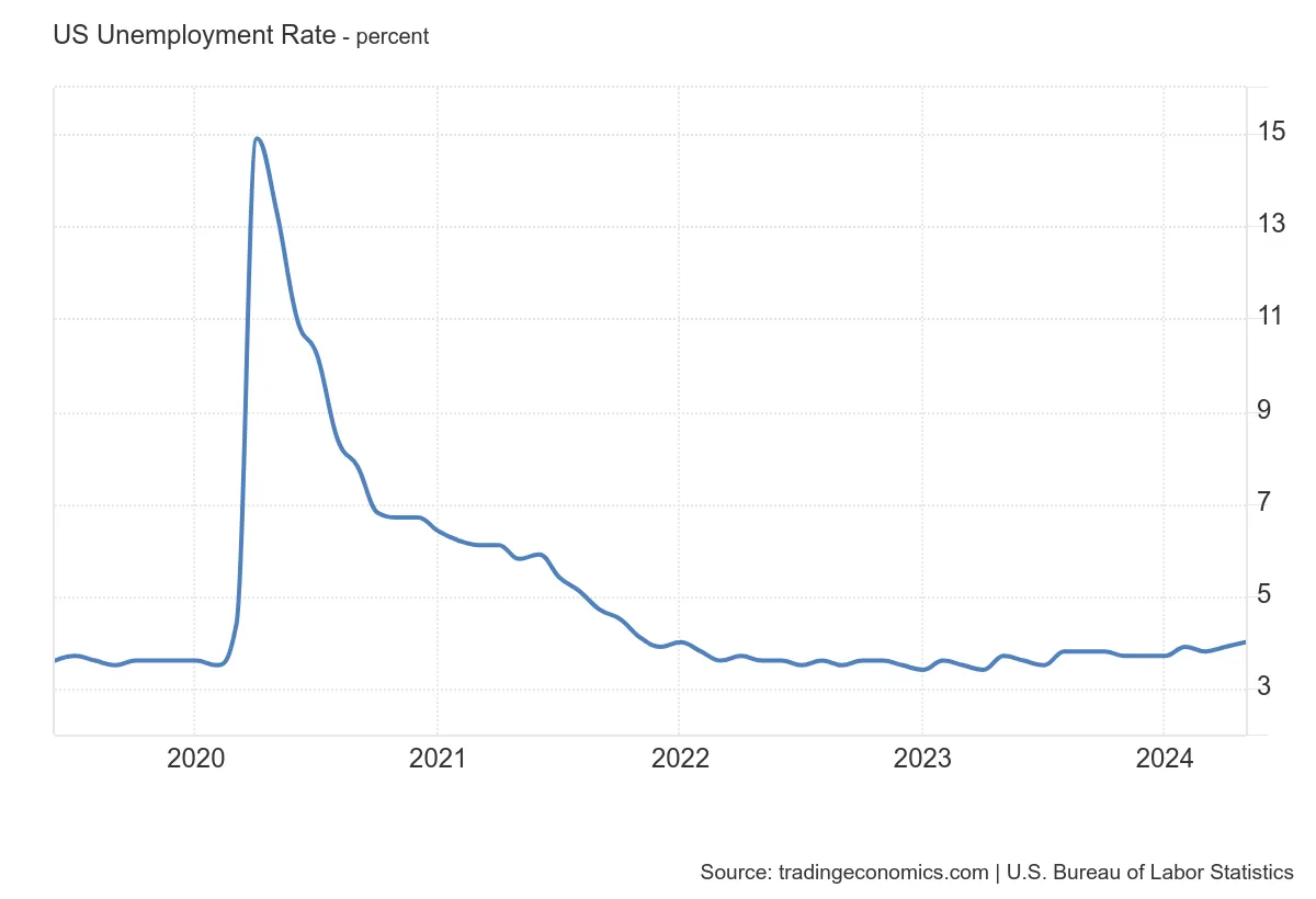 Eso sí, la tasa de desempleo continúa su lenta pero inexorable escalada, y ya está en el 4% en mayo tras el 3,9% registrado en abril, una décima por encima de lo esperado por los analistas. Es la primera vez desde enero de 2022 que esta tasa escala al 4%.