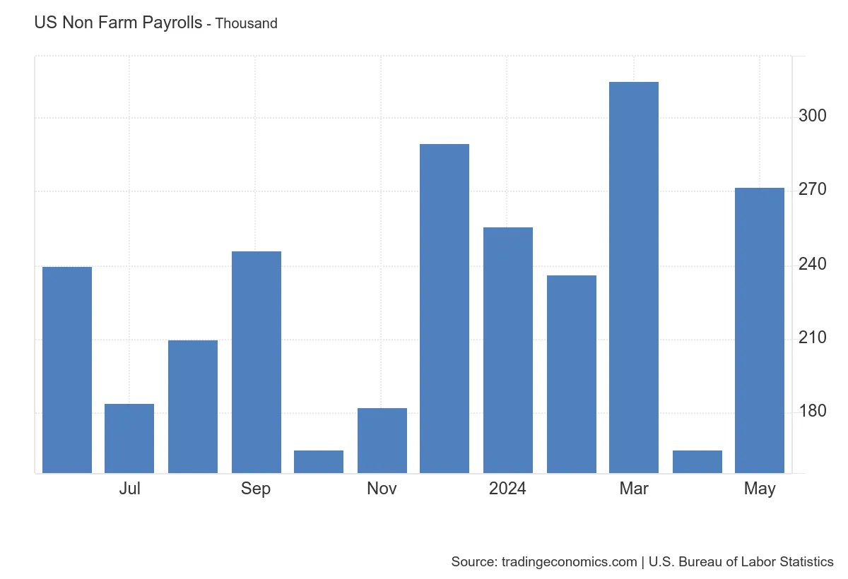 El mercado laboral estadounidense mostró una aceleración tras la desaceleración de abril, marcando 41 meses consecutivos de creación de empleo. La cifra de mayo de 2024 supera también el promedio de los últimos doce meses, que es de 232.000 nuevos empleos.
