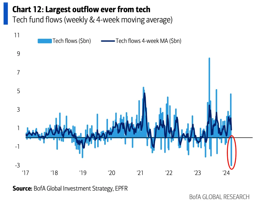 Los fondos de tecnología han tenido una salida sin precedentes de 4.400 millones de dólares en tan solo una semana. A pesar de esta salida de dinero, los fondos de renta variable han experimentado una entrada neta positiva de 6.900 millones, la séptima semana consecutiva de entradas de capital, acumulando un total de 91.000 millones de dólares de entradas netas consecutivas (la racha más fuerte en dos años),