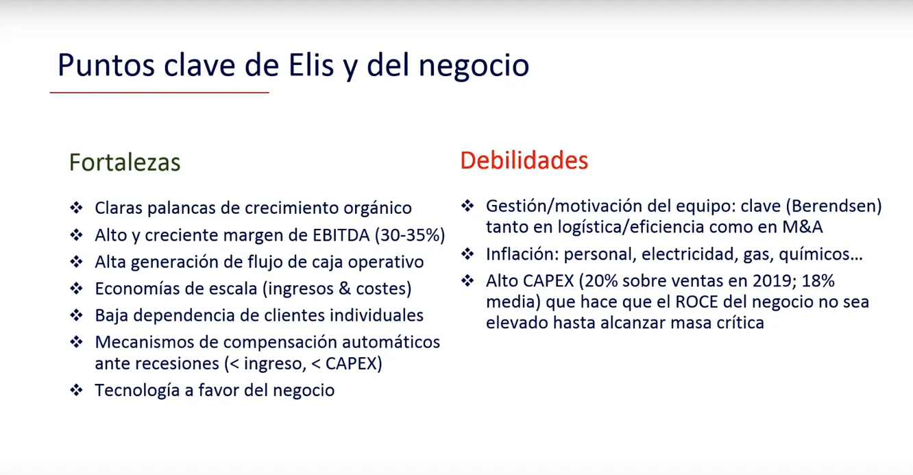 Algunas de las fortalezas de Elis según el gestor de March A.M. son: palancas de crecimiento orgánico, alto y creciente margen de Ebitda (30-35%), alta generación de flujo de caja operativo, economías de escala, baja dependencia de clientes individuales, mecanismos de compensación automáticos ante recesiones y una tecnología a favor del negocio.