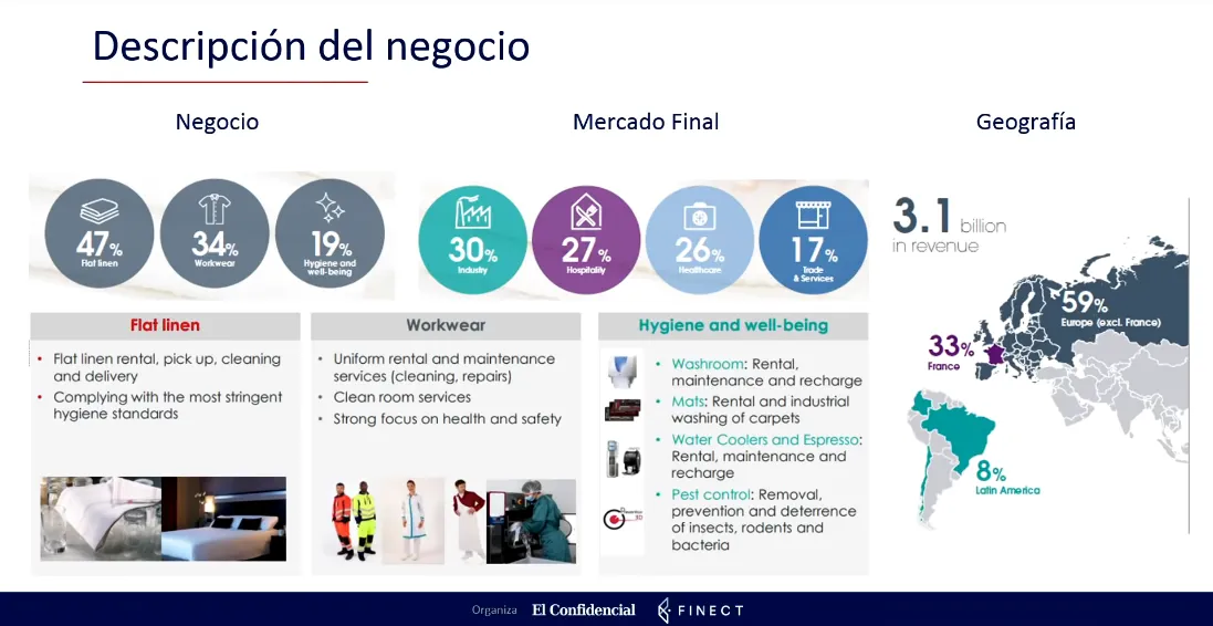 Elis es un proveedor internacional multiservicio de textiles, higiénicos y para instalaciones. Es un negocio de subcontratación de hoteles y otras superficies, siendo líder en la mayoría de los 28 países en los que opera. Combina un negocio logístico con el industrial.