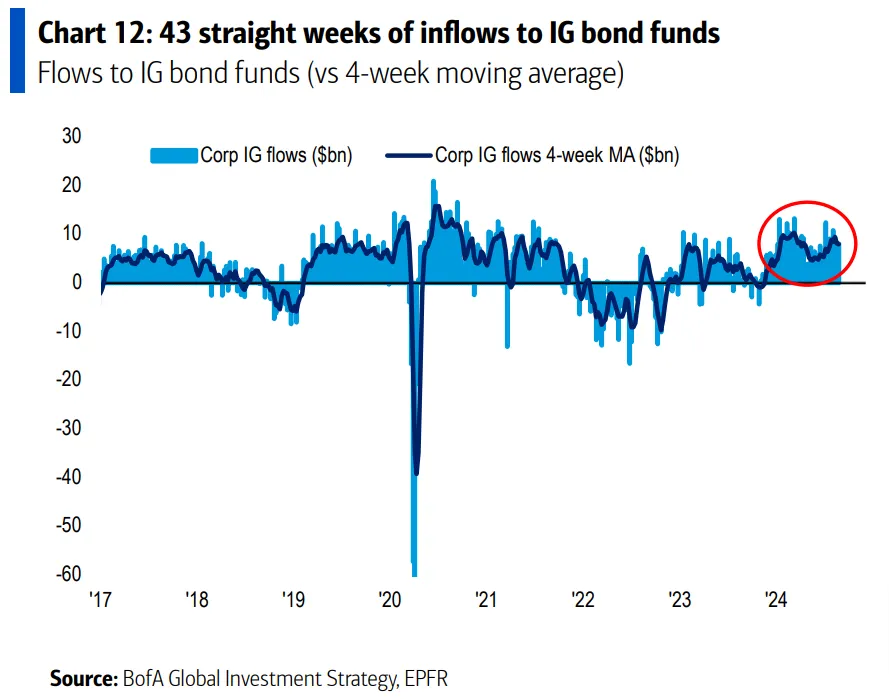 Más concretamente, los bonos de grado de inversión (investment grade) destacaron con 8.100 millones de dólares en su 43ª semana consecutiva de entradas, mientras que los bonos de alto rendimiento (high yield) experimentaron su mayor entrada en cuatro semanas, con 2.400 millones de dólares.