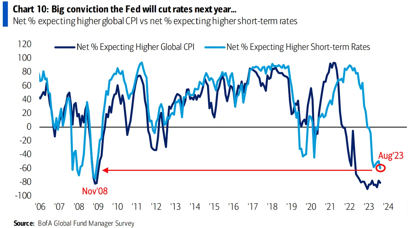 De hecho, el porcentaje neto de gestores que esperan que los tipos sean en un año mayores al os que hay ahora está en mínimos desde noviembre de 2008.