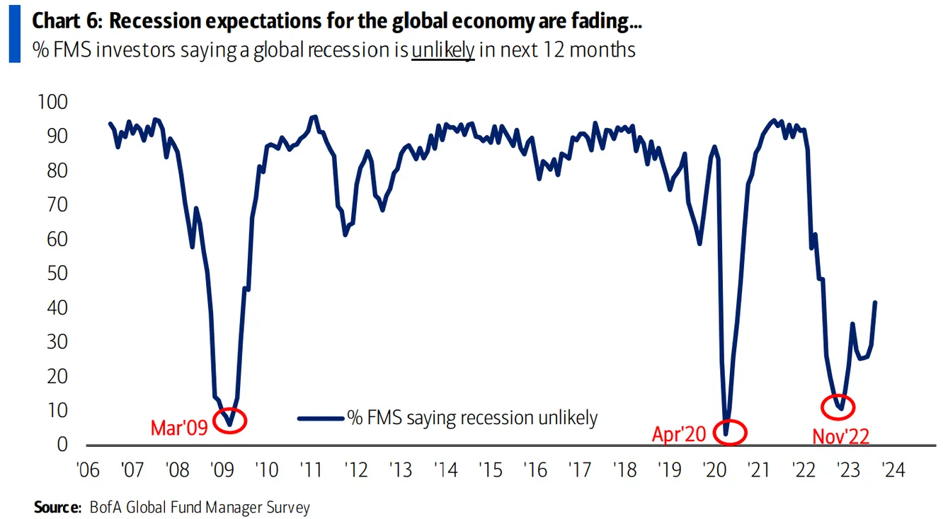 Y después de todo lo que se ha hablado sobre una posible recesión económica global, finalmente ésta no se espera por lo menos hasta 2025. Esto es, al menos, lo que piensan el 31% de los gestores de fondos de inversión en la última encuesta de Bank of America.
