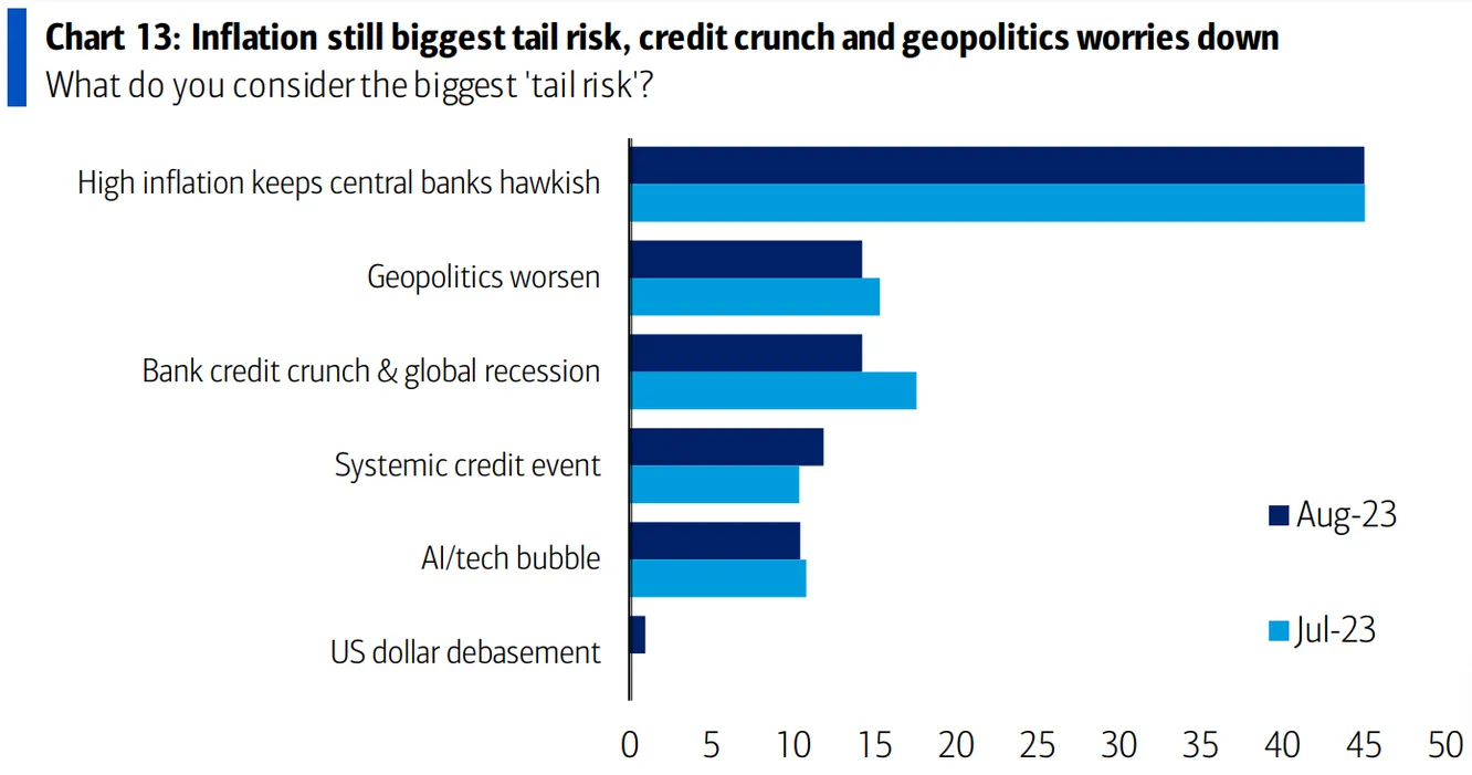 Tal y como puede apreciarse en el gráfico de arriba, la última encuesta revela un declive en la preocupación por una recesión global. Si bien en la encuesta de julio entre estos gestores (que gestionan 545.000 millones de dólares de patrimonio en total) la opción mayoritaria (25%) era que esperaban una recesión en el último trimestre de 2023, este sentimiento negativo parece haberse dado la vuelta.