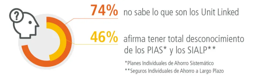 En cuanto al grado de conocimiento de productos financieros: la inmensa mayoría conocen las hipotecas (96%), los planes de pensiones (95%), los seguros de vida (96%) y las cuentas corrientes (81%), pero ni idea sobre Unit Linked (74% no sabe lo que son), PIAS y SIALP (46% de desconocimiento y 20%-30% de gente que cree saber lo que son pero se equivocan en su uso).