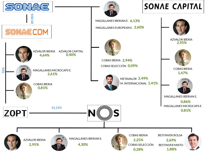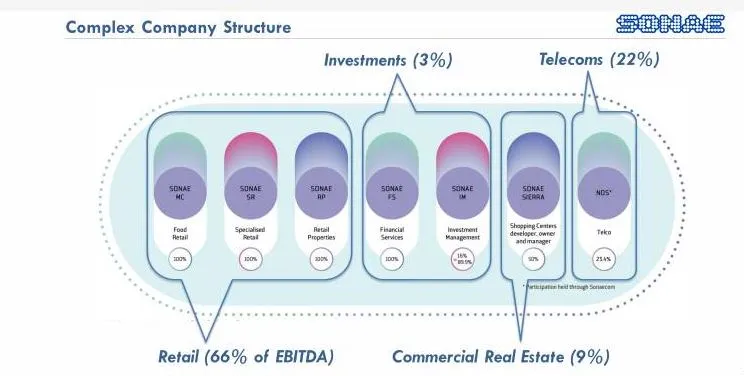 Cuatro de las firmas son las que cotizan en bolsa. SONAE SGPS S.A, es la matriz del grupo, ya hemos comentado arriba su estructura. Además ostenta un 88,36% de SONAECOM otras de las cotizadas (división donde está el negocio de las telecomunicaciones) y tiene el 89,9% de los derechos de voto. De esta manera, a través de SONAECOM posee el 50% de ZOPT accionista controlador de NOS (segundo mayor operador de Telecoms en Portugal después de Portugal Telecom) con una participación del 52.15% del capital.