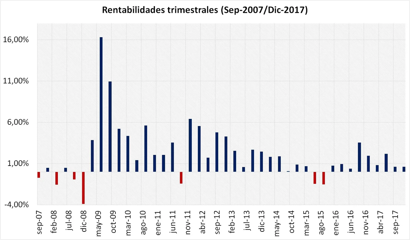 Como podemos observar en el gráfico, en los últimos 10 años el fondo sólo ha registrado siete trimestres con rentabilidades negativas. Cuatro de ellos, al comienzo de la crisis financiera en el año 2007, registrando el peor trimestre en diciembre de 2008, en el que la caída fue cercana al 4%, nada mal si tenemos en cuenta que tres meses antes había sido anunciada la quiebra de Lehman Brothers.