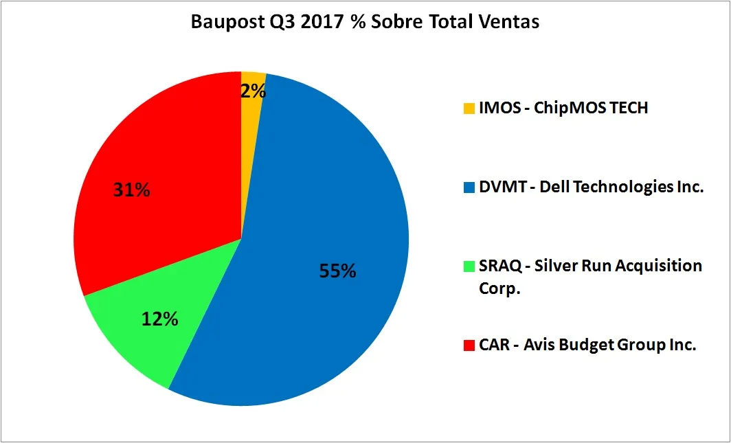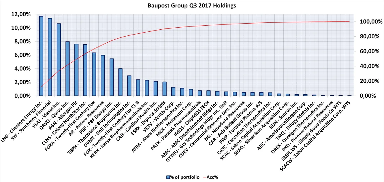 A continuación se muestran las posiciones reportadas a la SEC por Baupost Group a fecha de cierre del tercer trimestre de 2017. Las barras representan el peso que tienen en cartera cada una de las inversiones. Mientras que la línea roja muestra el peso acumulado de las compañías en el fondo: es decir, en este caso, las tres primeras posiciones suponen, en conjunto, un 33,68% de la cartera.