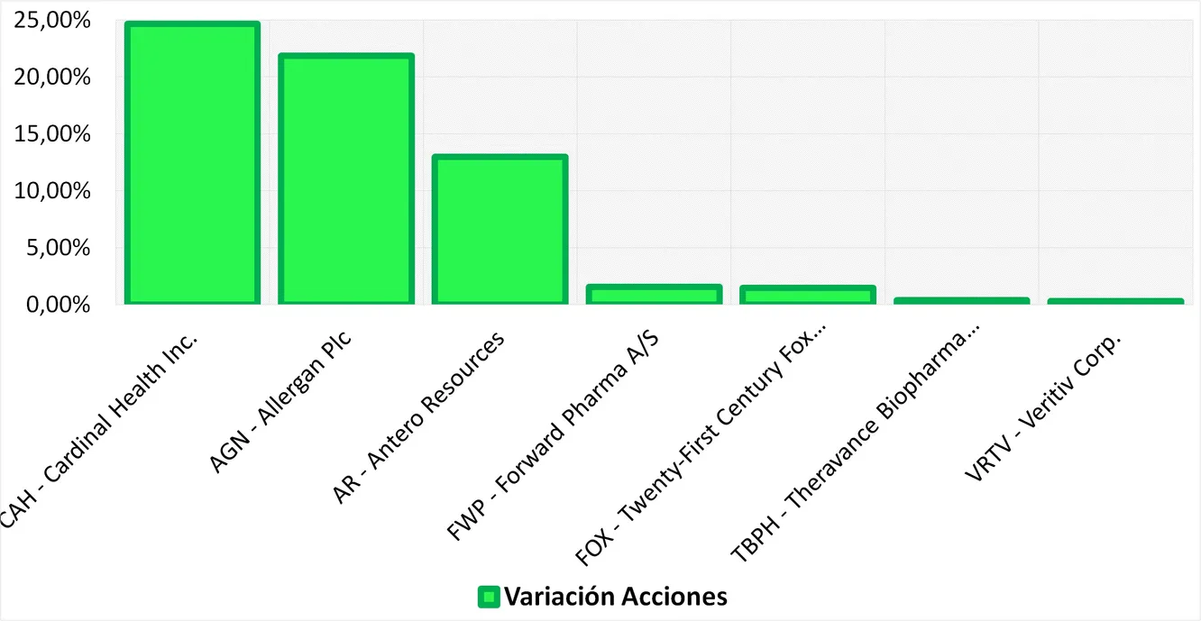 Siete posiciones han visto incrementada su exposición en cartera durante el tercer trimestre. La valoración de las posiciones incrementadas suman un total de 2,52%. La adquisición de nuevas acciones de Allergan supone el mayor porcentaje sobre el total de las compras. De esta manera la multinacional farmacéutica se sitúa como la quinta con mayor peso en cartera.