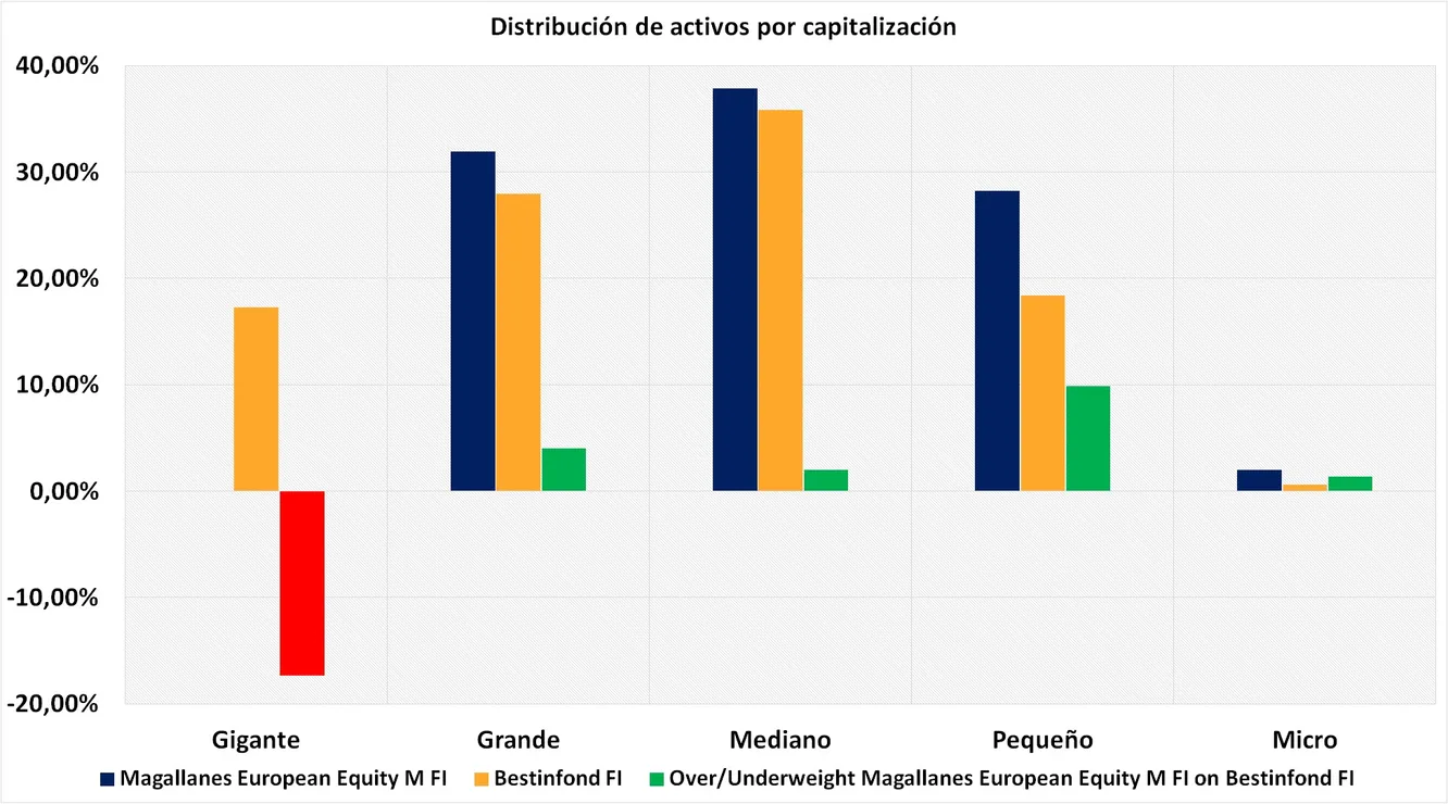 Ambos fondos tienen un sesgo hacia grandes y medianas capitalizaciones. Además Bestinfond FI tiene algo de peso hacia empresas de gigante capitalización.