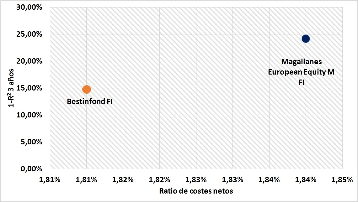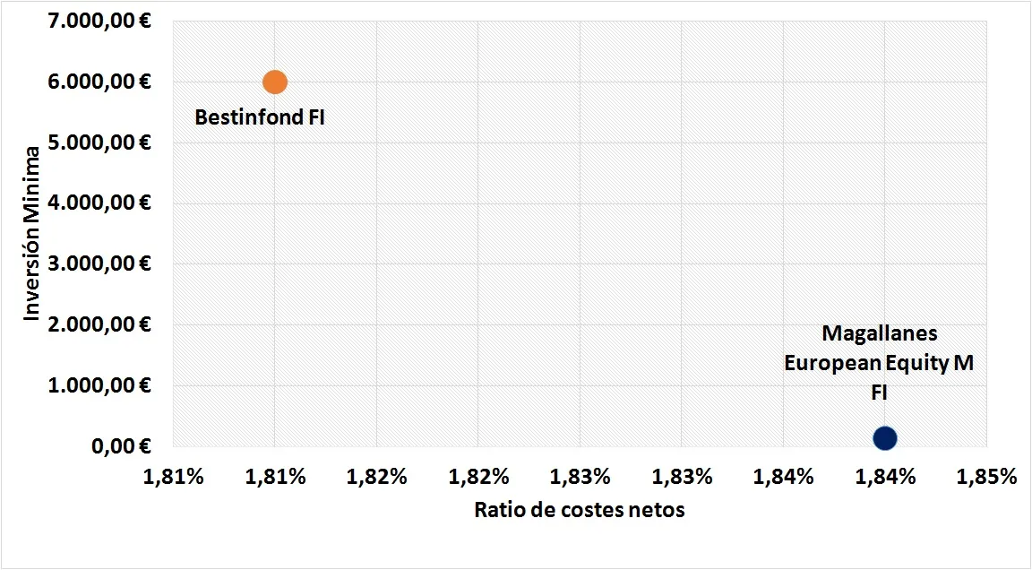 La inversión mínima en el caso de Bestinfond FI es de 6.000 euros mientras que para el fondo de Magallanes es de una participación (alrededor de 160 euros). Ambos fondos presentan una comisión de gestión del 1,75%. En cuanto al ratio de costes netos es algo superior para Magallanes European Equity M FI del 1,81% con respecto al 1,84% que presenta Bestinfond FI.