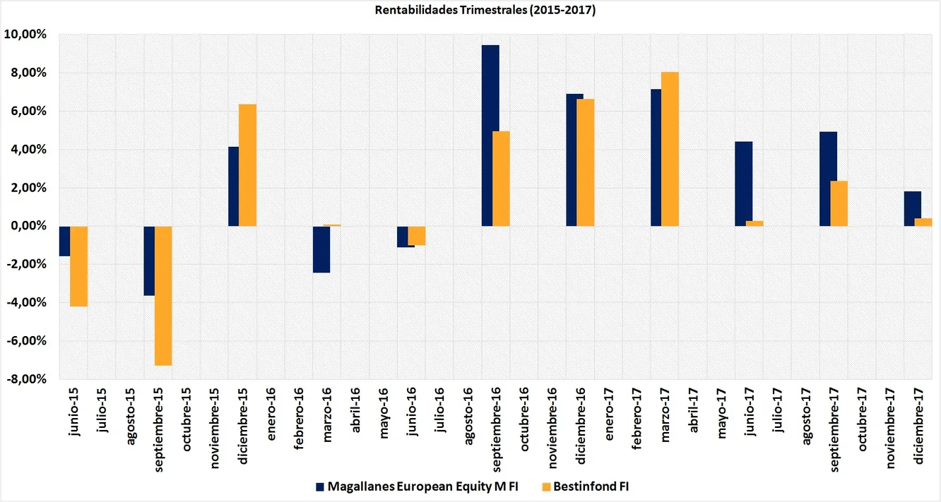 Si agrupamos las rentabilidades en trimestres, podemos observar como de los últimos 11 trimestres Magallanes European Equity M FI ha mejorado la rentabilidad del Bestinfond FI en 7 trimestres.
