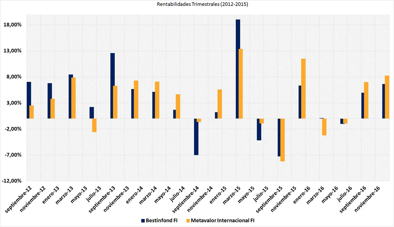 Si agrupamos las rentabilidades en trimestres, podemos observar como de los últimos 18 trimestres Metavalor Internacional FI ha mejorado la rentabilidad del Bestinfond FI en 10 trimestres.