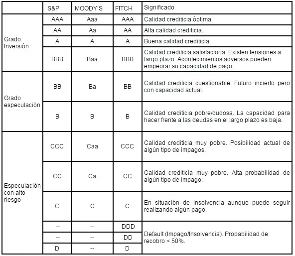 A continuación os dejo una tabla con la clasificación de la deuda en función de la agencia de calificación:
