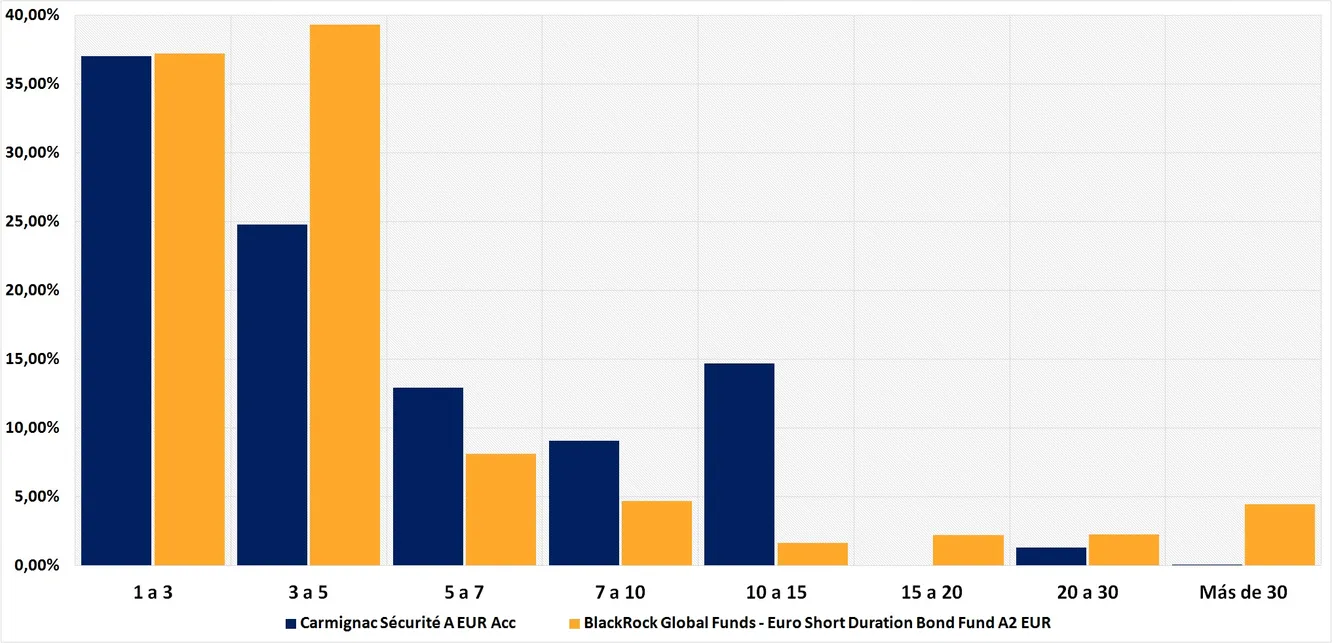 Ambos fondos aglutinan un mayor porcentaje de la cartera en obligaciones con vencimiento entre 1 y 3 años y entre 3 y 5 años. El fondo de Carmignac mantiene un porcentaje superior que el de Blackrock en bonos con un vencimiento comprendido en los intervalos de 5 a 15 años pero la situación se revierte a partir de los 15 años. Hay que recordar que cuanto más alejado sea el vencimiento mayor puede ser el impacto sobre el precio de una variación de los tipos de interés.