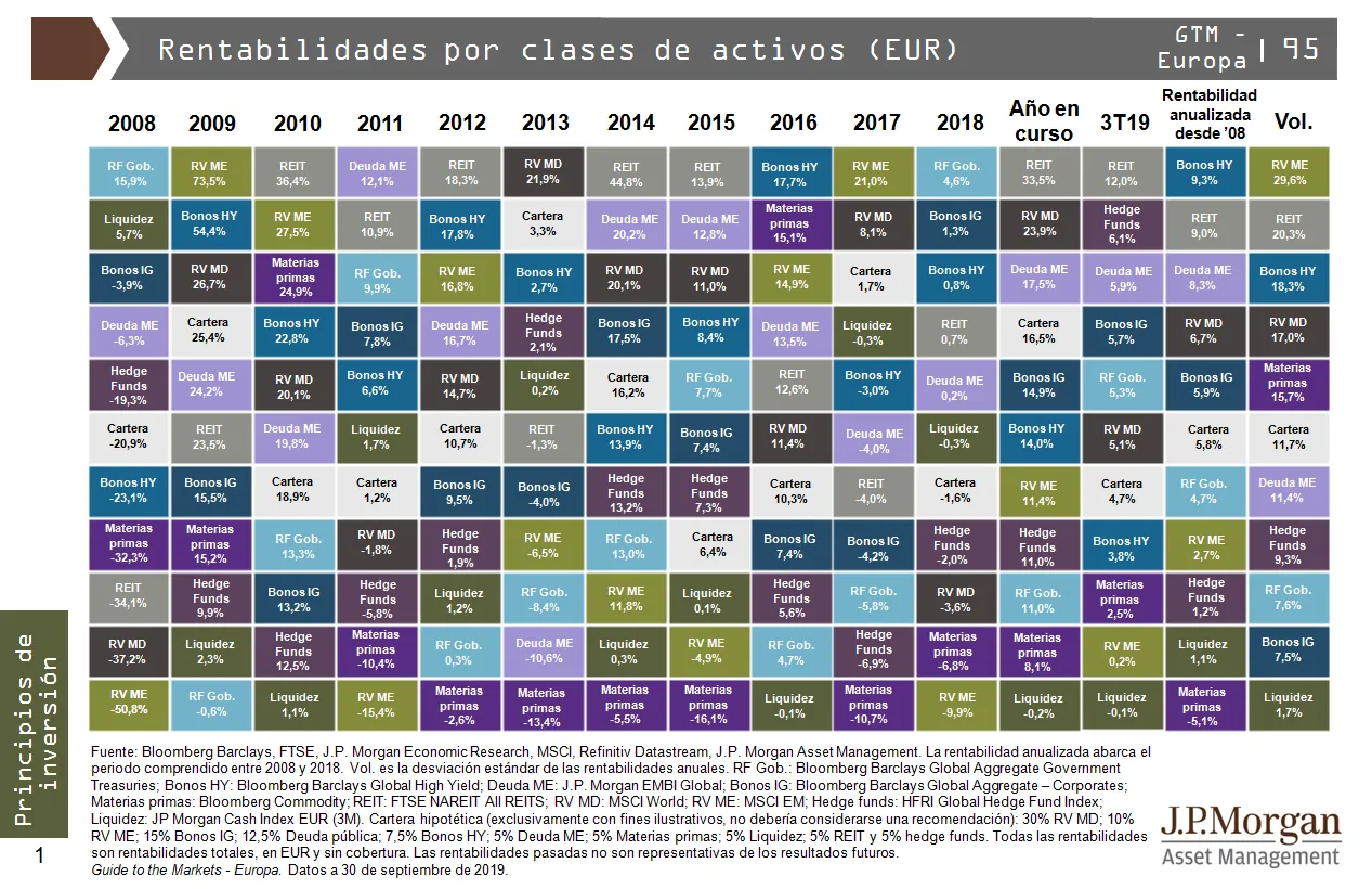 A continuación tenemos la foto que recoge la rentabilidad de los diferentes activos en los últimos 10 años: