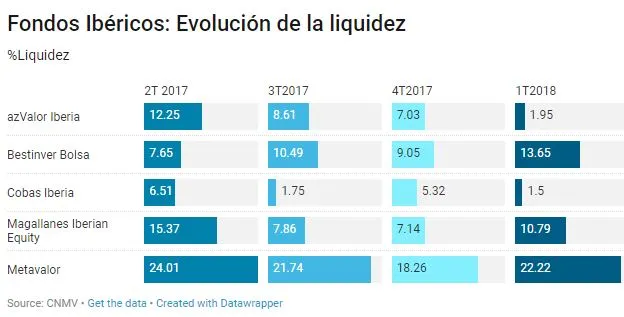 En el caso de los fondos ibéricos, los resultados son algo diferentes y no hay una tendencia tan clara. azValor Iberia es el caso más significativo: reduce su liquidez desde el 12,25% hasta el 1,95% registrado en este primer trimestre. Bestinver ha aumentado su porcentaje durante este trimestre hasta alcanzar el 13,65% a la espera de encontrar nuevas oportunidades. A pesar de ello, el fondo más rentable a largo plazo perteneciente a esta categoría, Metavalor FI es el que mantiene un mayor porcentaje de liquidez en cartera, concretamente del 22,22%.
