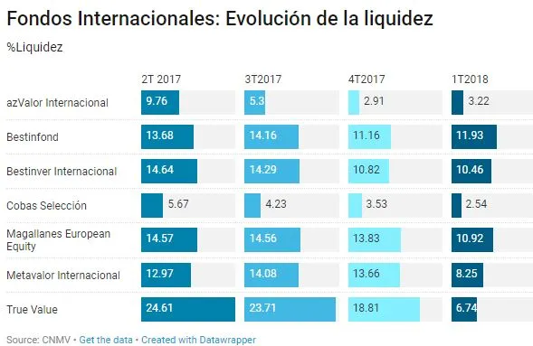 En el gráfico que aparece a continuación se muestra la evolución de la liquidez desde el segundo trimestre de 2017 en la cartera de los fondos internacionales de azValor, Bestinver, Cobas, Magallanes, Metavalor y True Value. Tal y como podemos ver todos los fondos han aprovechado la volatilidad para incorporar compañías a sus carteras y reducir el excedente de liquidez. El caso más notable ha sido el de True Value, que ha reducido su liquidez desde el 24,61% que registraba en el segundo trimestre a niveles del 6,74%. Y no es el único azValor Internacional reduce su liquidez desde casi un 10% hasta algo más del 3% durante este primer trimestre de 2018.
