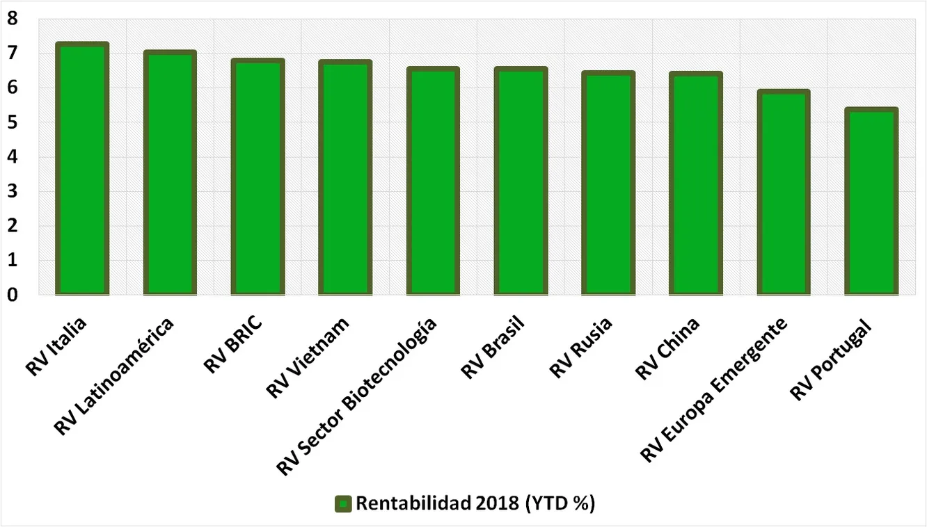 Casi terminado enero así es como quedan las categorías de fondos de inversión más y menos rentables en este primer mes del año. Liderando las subidas (por países) destacan RV Italia, RV Latinoamérica y RV BRIC (emergentes) con rentabilidades que se sitúan entre el 6-7%. La bolsa italiana registró un fantástico 2017 y el índice FTSE MIB cerró 2017 con subidas del 17%.