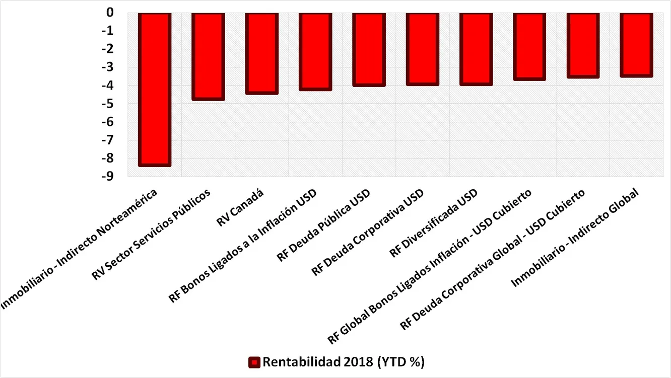 En lo que se refiere a las peores categorías de este 2018, el Inmobiliario Indirecto de Norteamérica se sitúa como la peor de todas con rentabilidades inferiores al 8% y ya se colaba en 2017 como una de las peores categorías. Varias categorías de fondos de renta fija vuelven a situarse entre las menos rentables en parte por el efecto divisa.